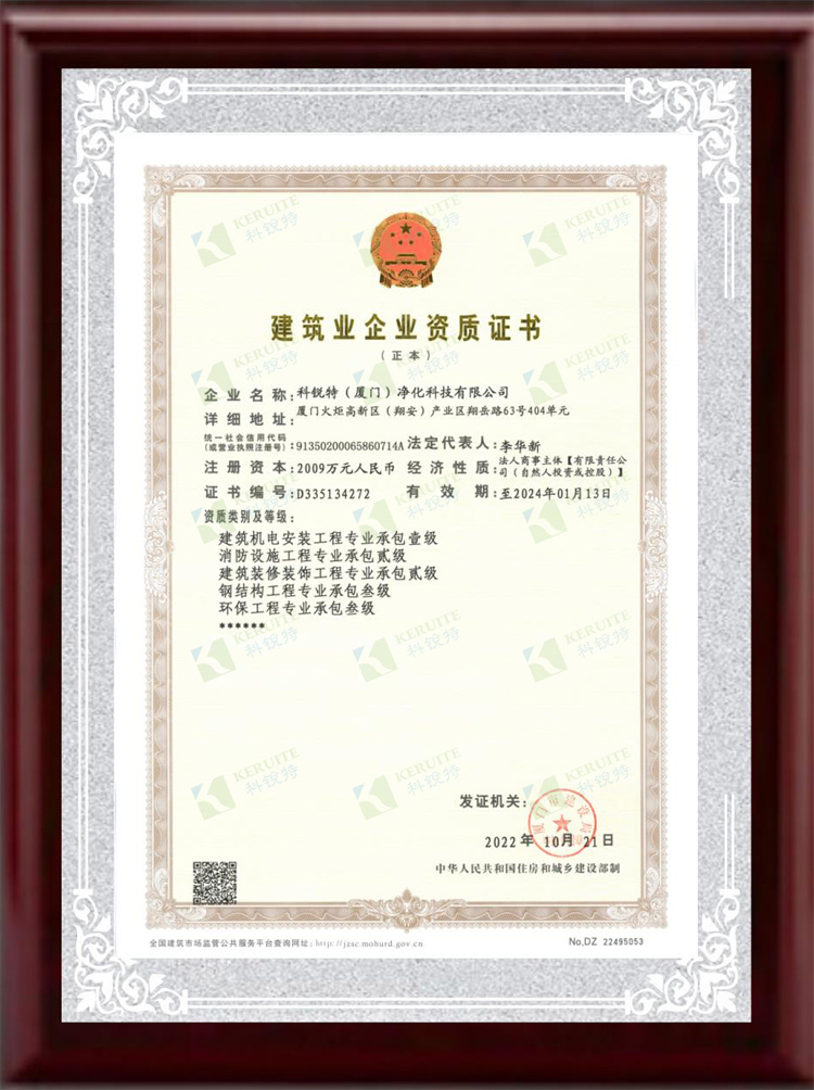 十月上旬,科銳特(廈門)凈化科技有限公司順利通過審批取得《建筑機電安裝工程專業(yè)承包壹級》資質(zhì)。(凈化工程)
